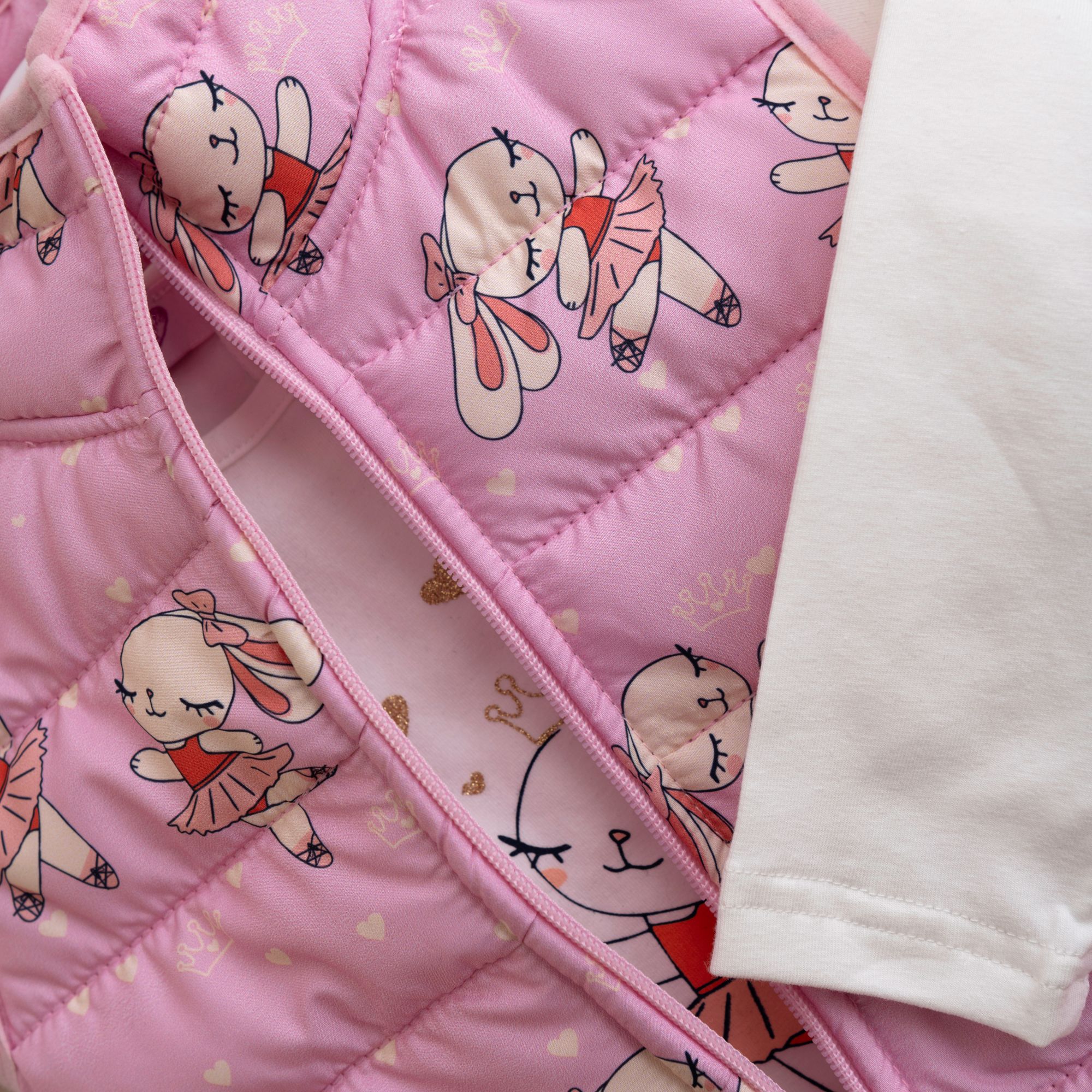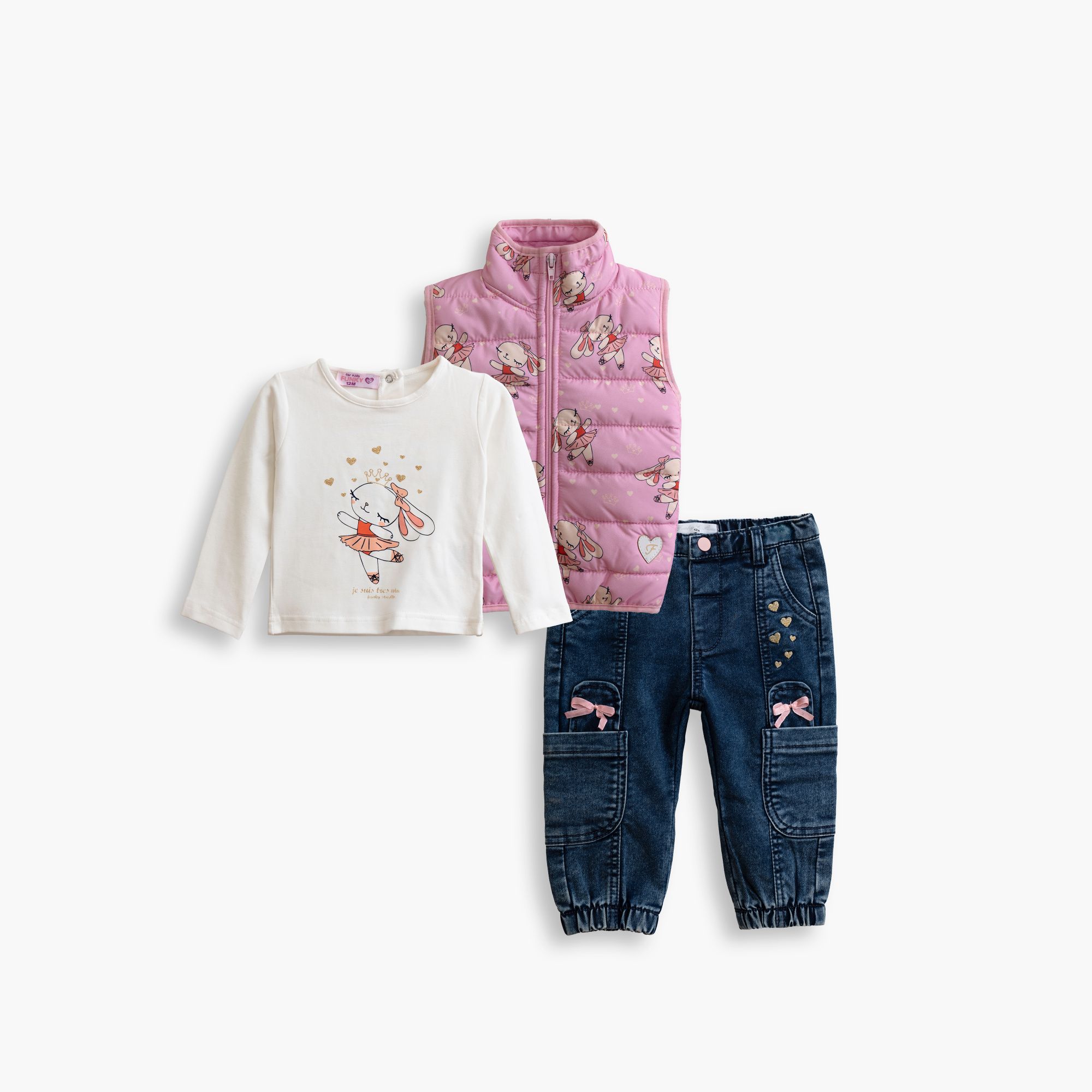 Σετ 3 τεμάχια τζάκετ αμάνικο με τύπωμα (κουνελάκια) allover και μπλούζα μακρυμάνικη κάλτσα λύκρα με τύπωμα και παντελόνι τζίν λύκρα σε χρώμα mistyrose/εκρού/τζίν για κορίτσι μηνών