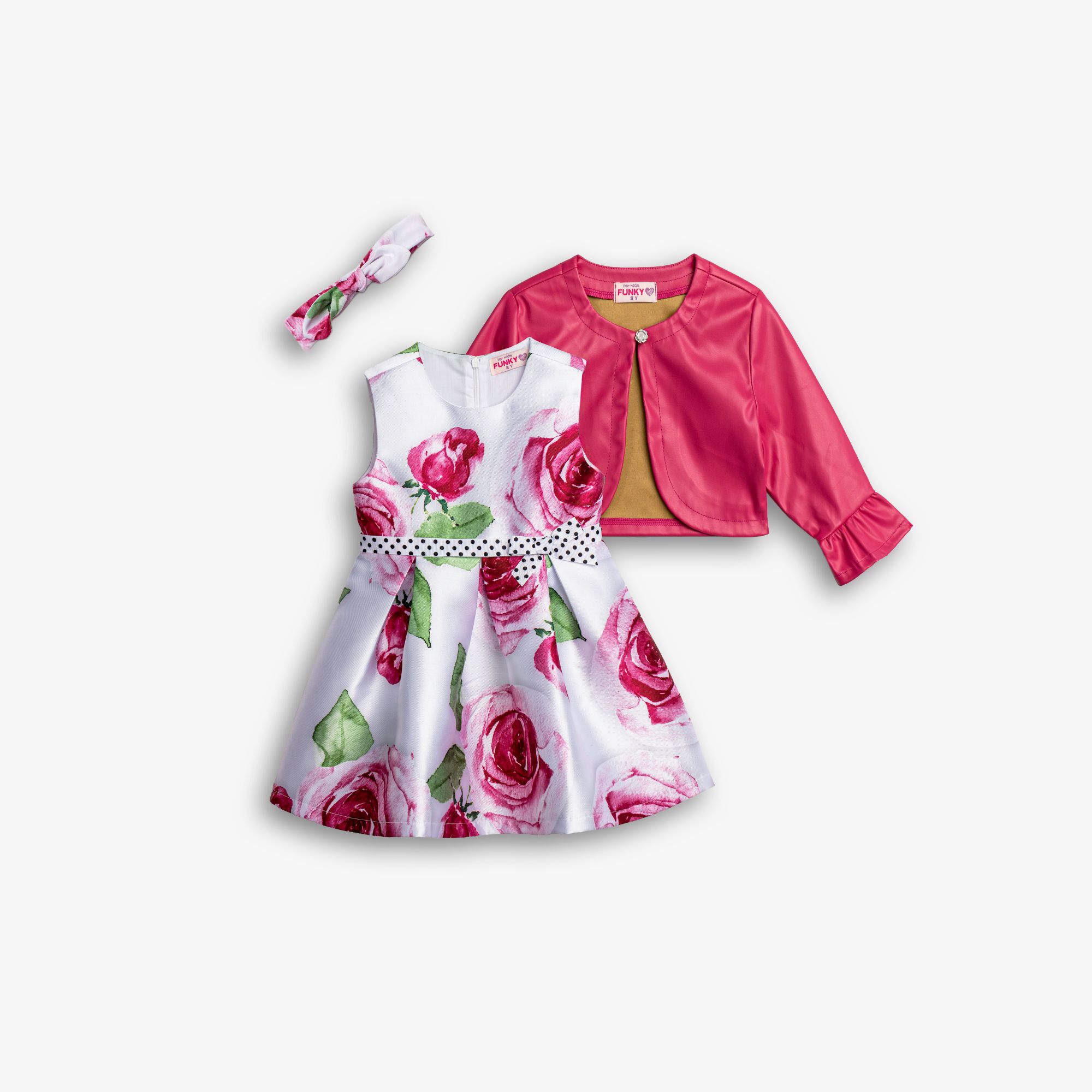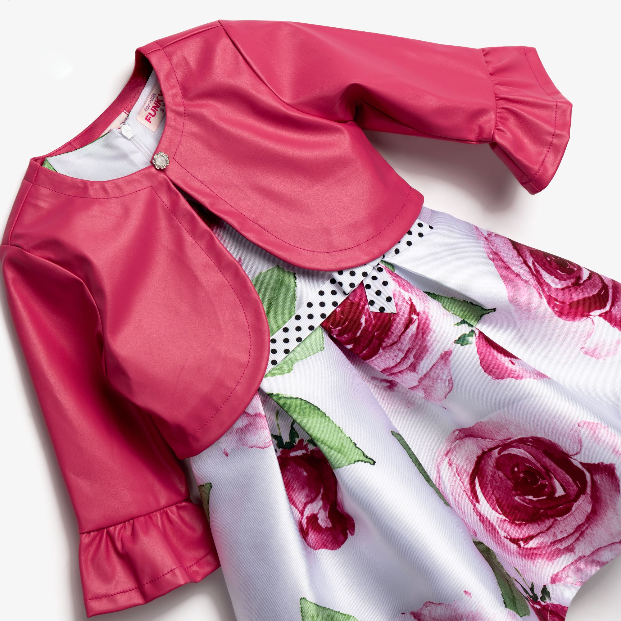 Σετ τζάκετ, φόρεμα με τύπωμα λουλούδια και με ζώνη πουά και κορδέλα σε χρώμα τύπος για κορίτσι 6-16 ετών