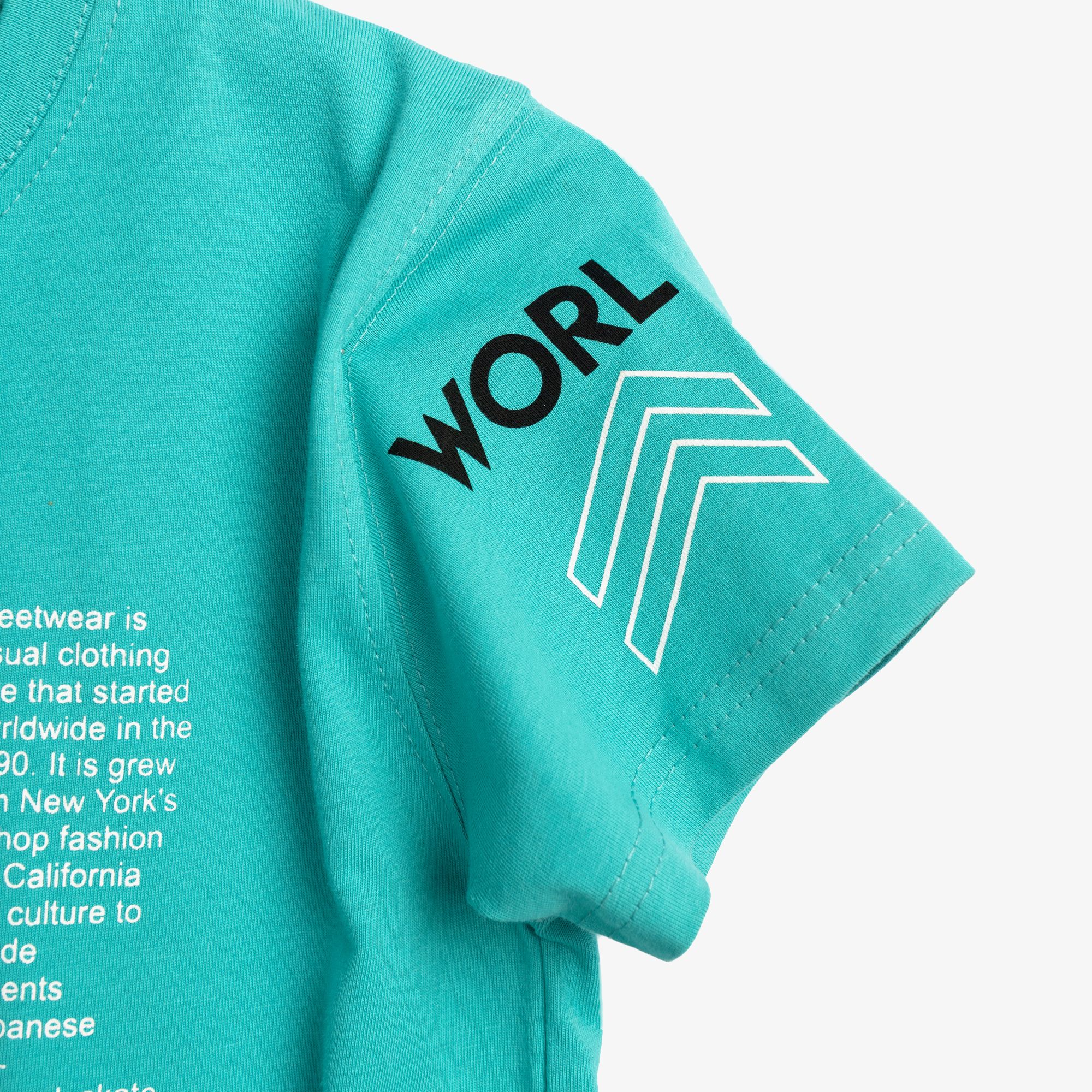 Set T-shirt with printing (worldwide) and corduroy fleece in color turqoise pool/black with printing for boys 6-16 years