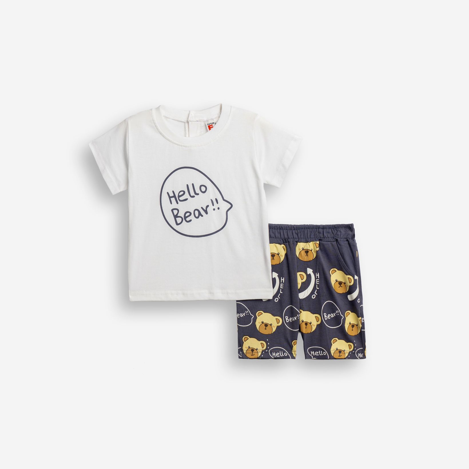 Set blouse jersey with printing (hello bear) and shorts with printing allover in color white/raf for boys months