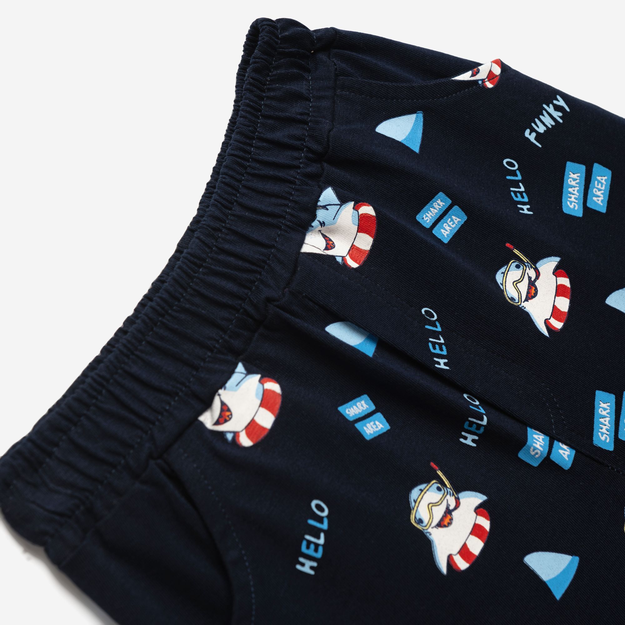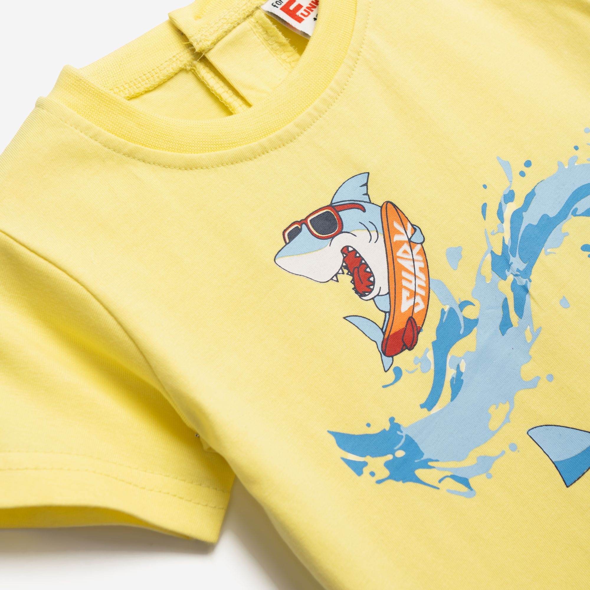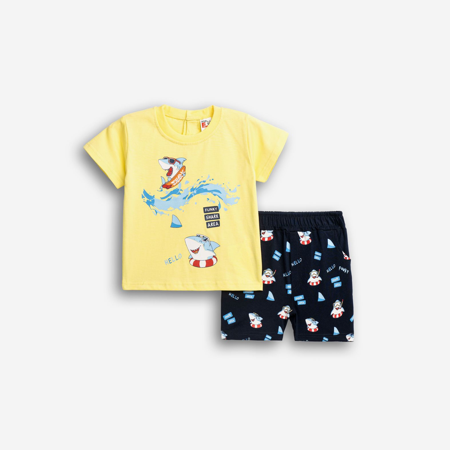 Set blouse jersey with printing (sharks) and shorts with printing allover in color light yellow/blue for boys months