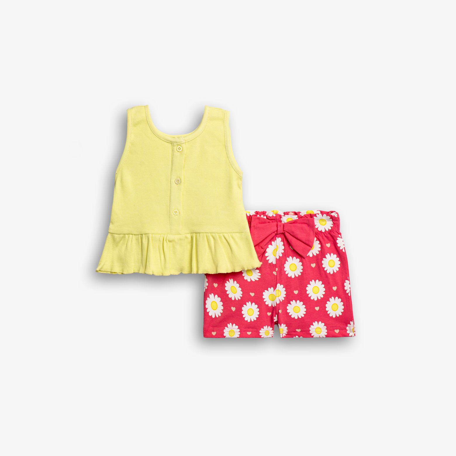 Set blouse and shorts with printing (chamomile) allover and headband in color sunny yellow/flamingo for girls months